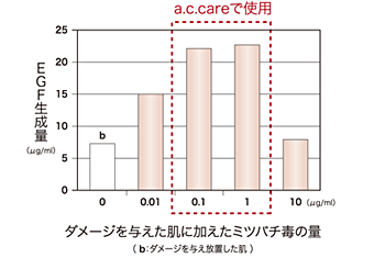 肌トラブルが起こったときに、"ミツバチ毒"を投与すると、未投与時よりも80%以上皮膚再生を行うことが実証済み。