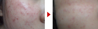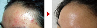 - 脂性肌で、おでこの二キビに赤みのある二キビが絶えなかった女性の結果。