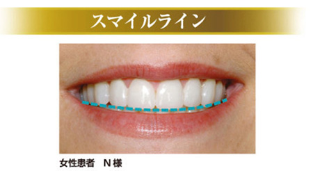 笑顔の時前歯の先端のラインが下唇内側のラインに 沿っていると笑顔が美しいく見えると言われています。